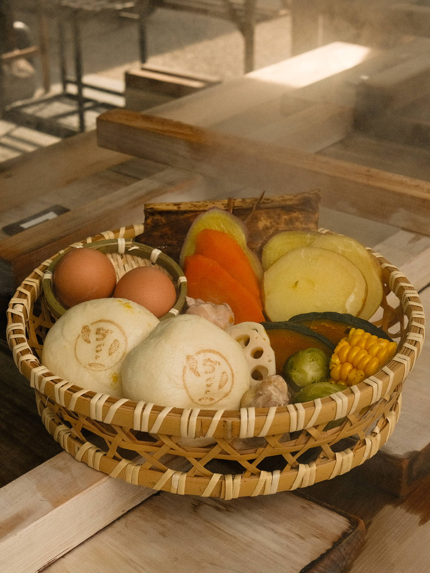 竹かごに野菜、魚介類、肉などを入れ、温泉の蒸気で一気に蒸し上げます。余分な脂や塩分を使わずに調理できるため、素材の旨味を逃しません。観光客にも人気の名物料理として、その場で出来立てを味わうことができます。
