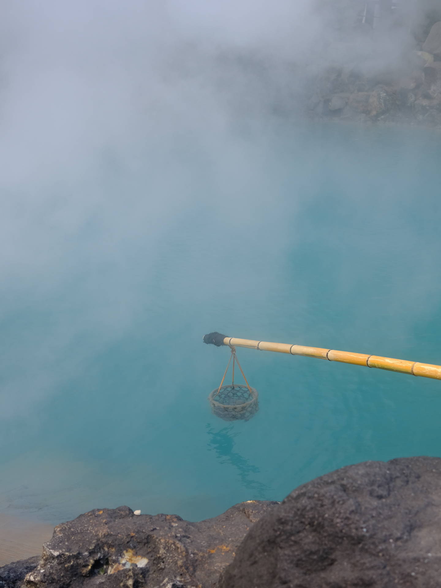 海地獄では竹かごに卵を入れ、約98度の蒸気で加熱して黄身が濃厚な温泉たまごを作ります。観光客に人気の名物として、その場で味わえます。