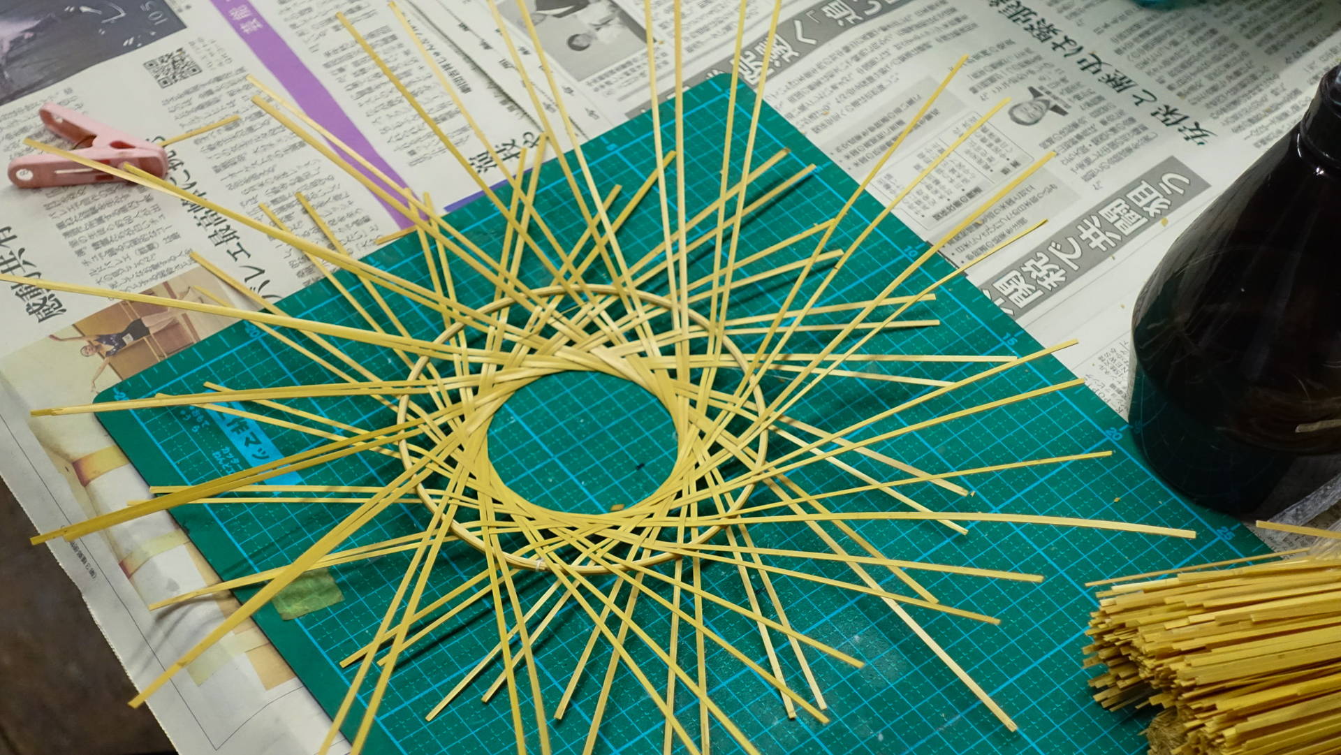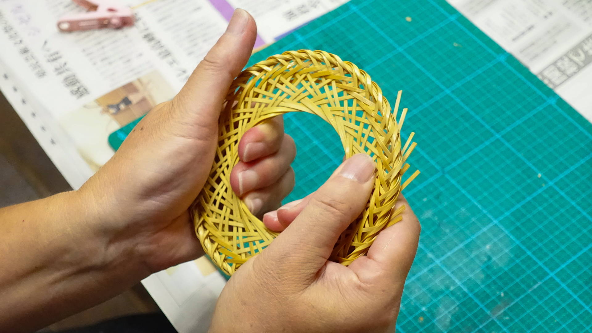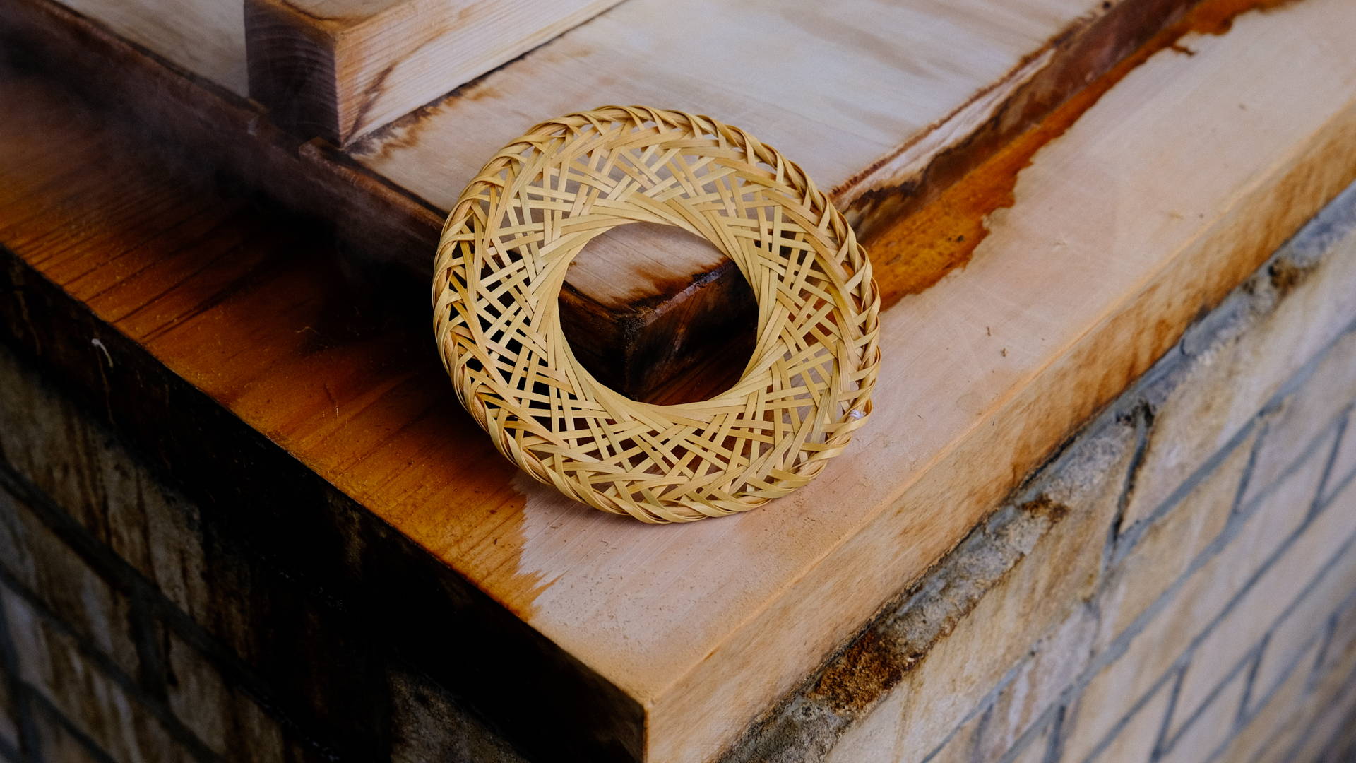 別府の竹細工にはさまざまな編み方がありますが、今回開発したドリッパーホルダーには、「輪弧(りんこ)編み」と呼ばれる、竹ひごを斜め方向に交差させながら、輪を重ねていくように編み進める技法を採用しています。