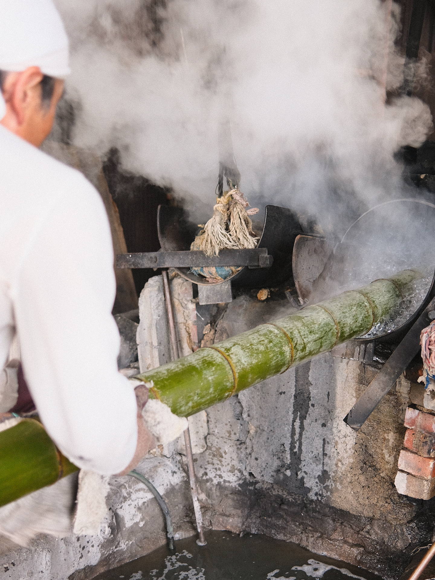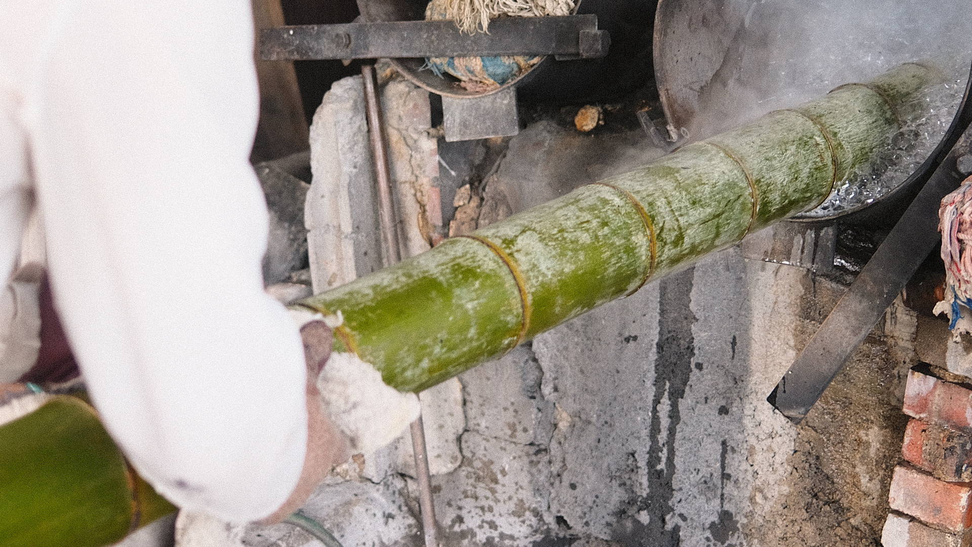 湯釜に水と苛性ソーダをいれ、沸騰したところに竹を入れる。