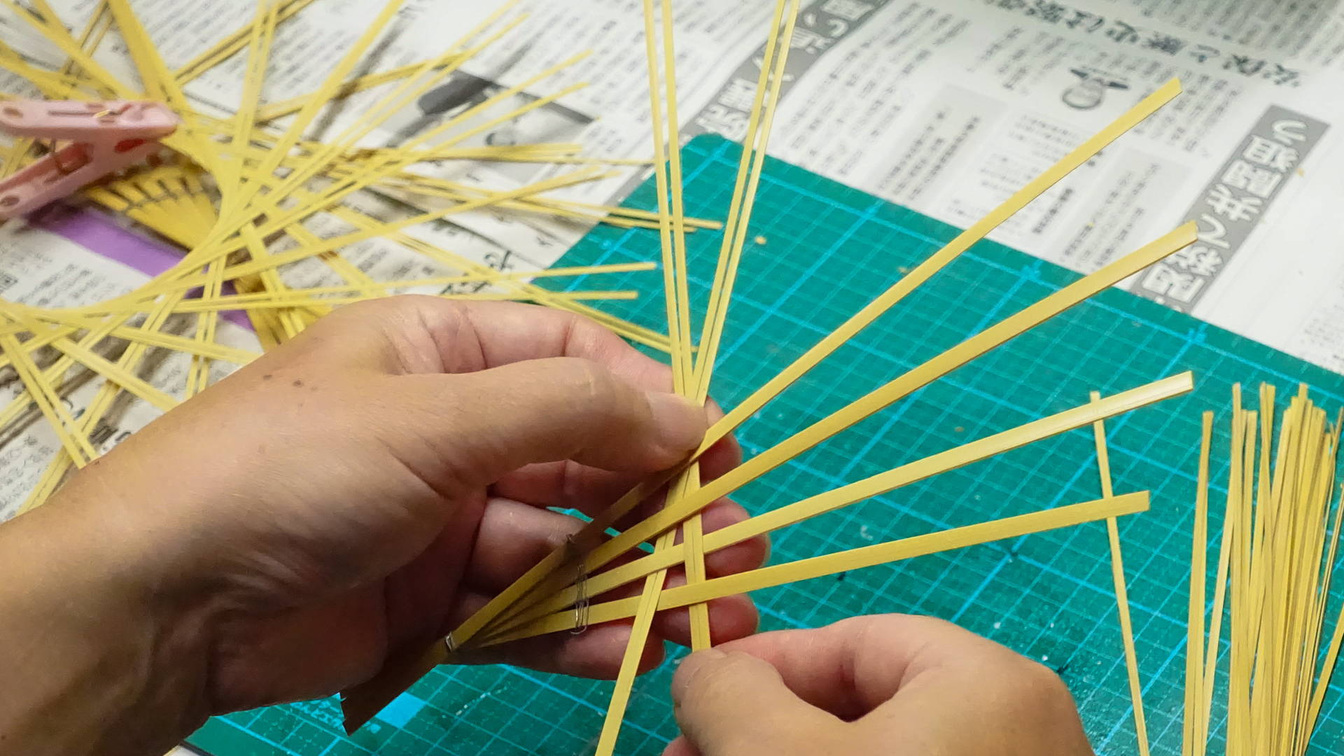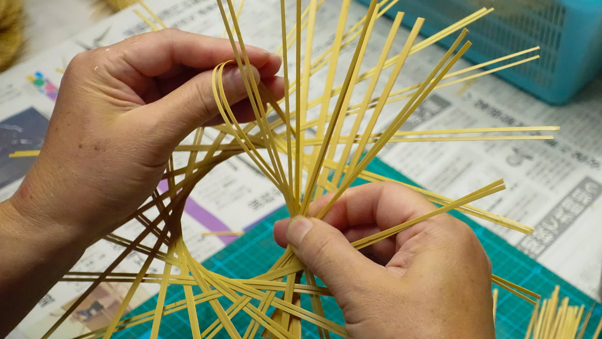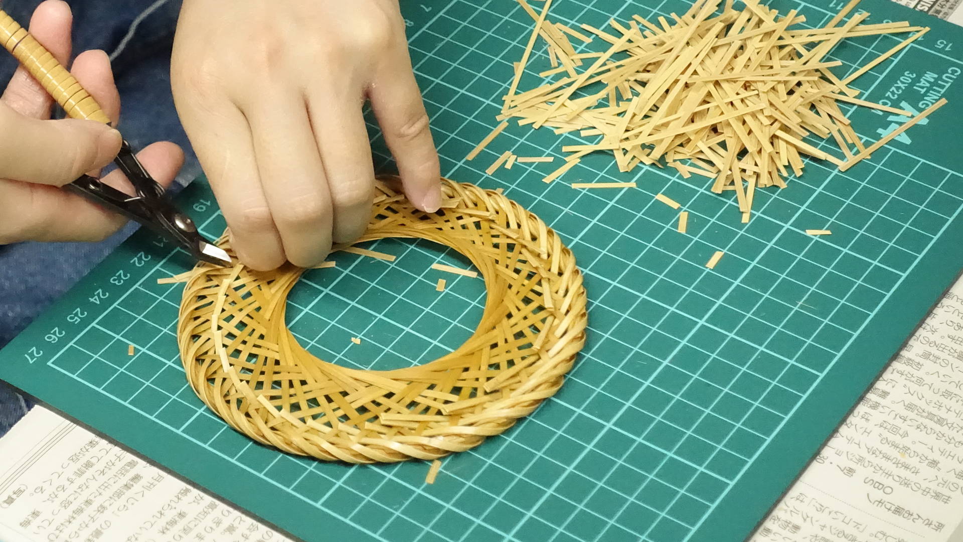 湯抜きと天日乾燥を施した竹は、竹細工に適した状態に整えたうえで、さらに細く割り、ひご状にしていきます。