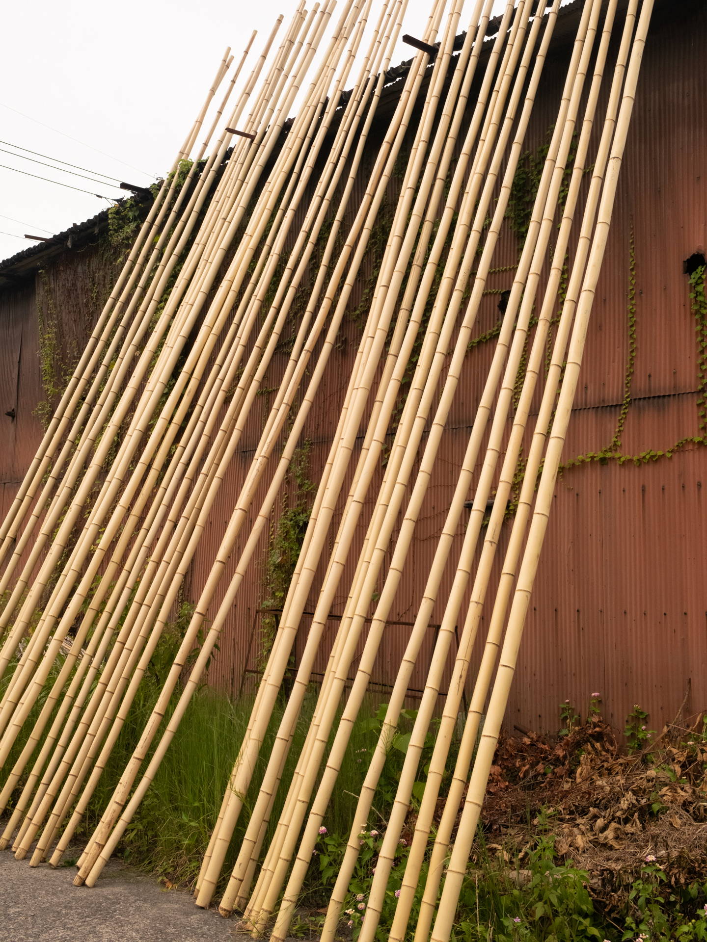湯抜きが終わった竹は立てかけて天日干しする。