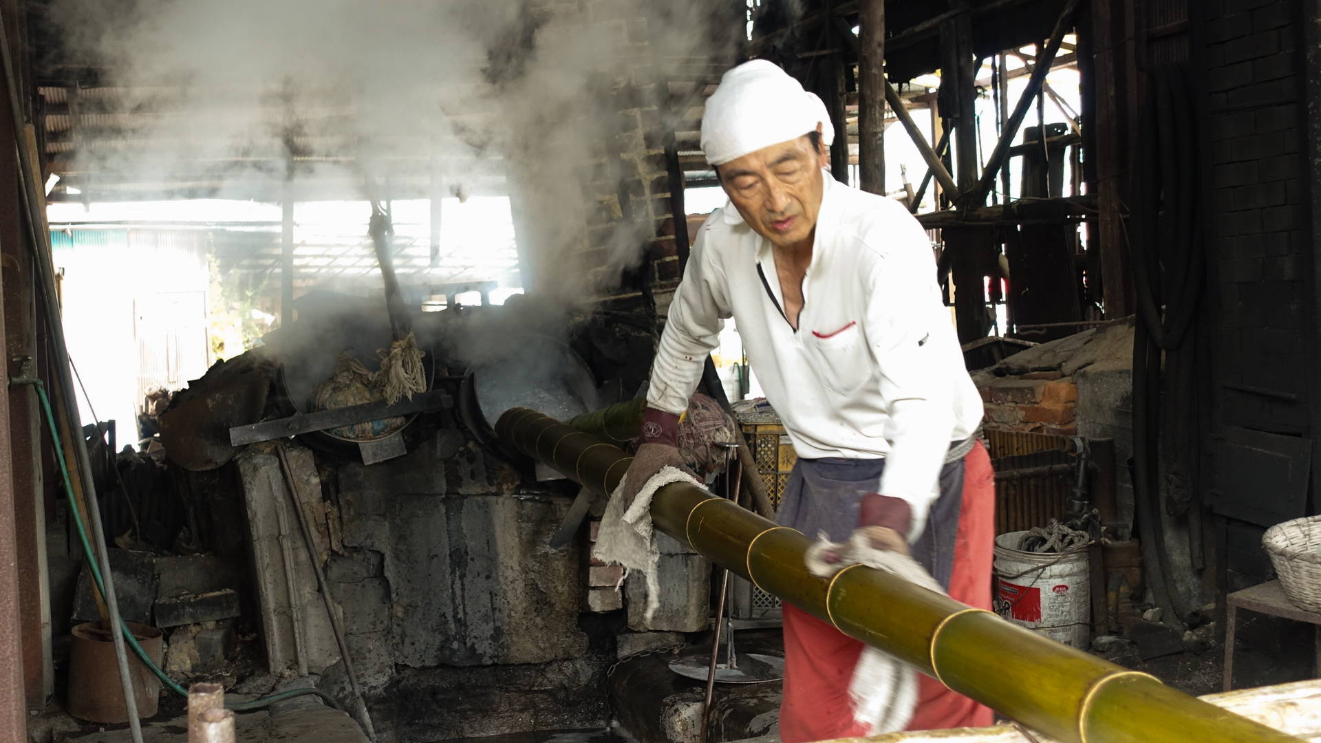 別府で唯一残る永井製竹では、代表取締役の茶 重之さんがおひとりで、今も湯抜きの作業を担っています。
