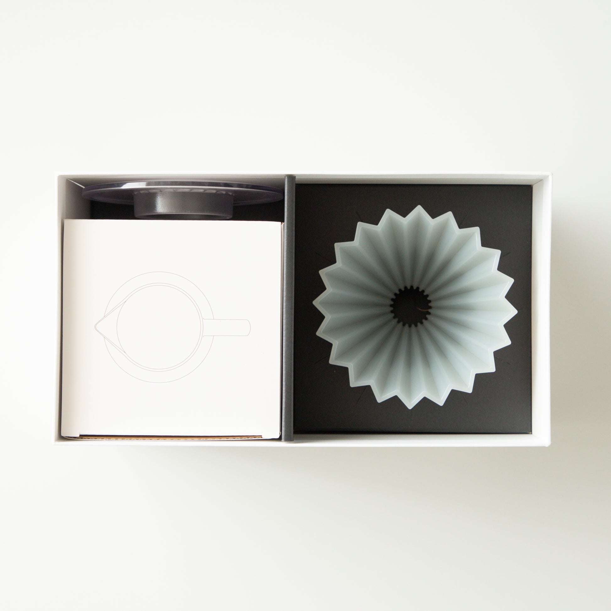 The original gift box that includes an ORIGAMI Dripper Air S, an aroma glass coffee server, a AS resin holder, and a paper filter. Choose your favorite dripper color and holder material.