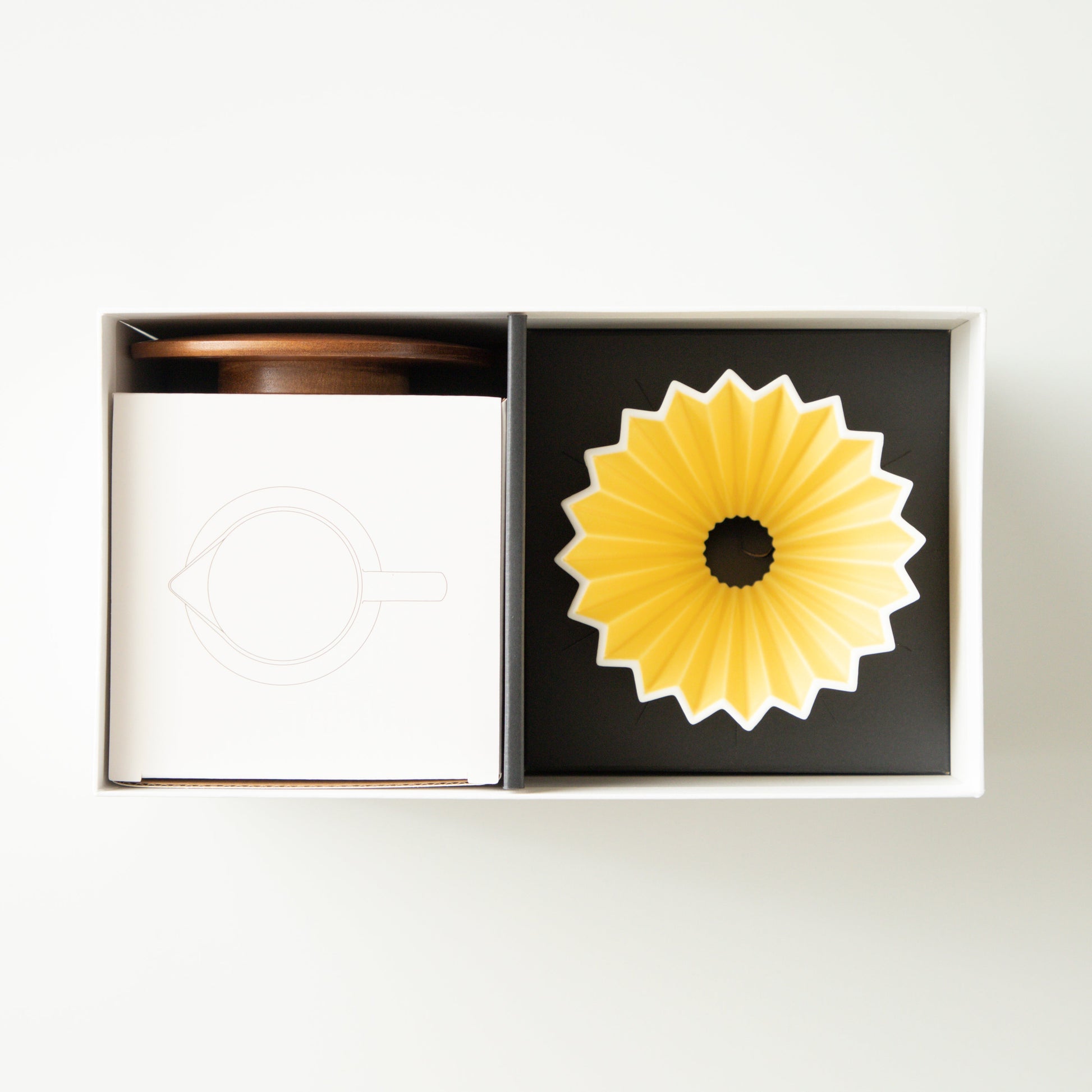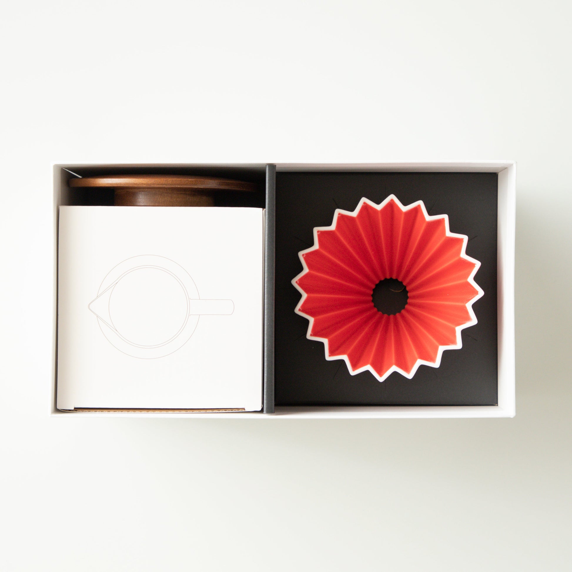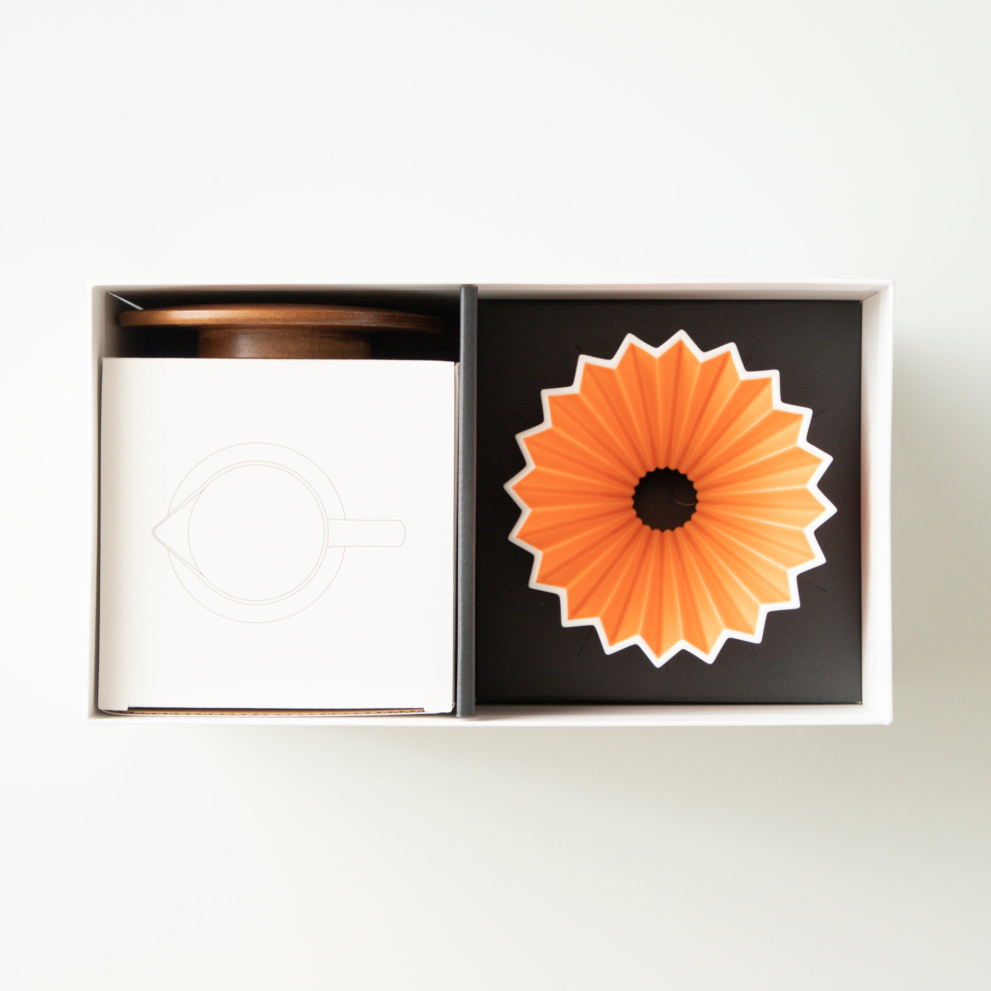 This is an original ORIGAMI Online Store gift box that includes the ORIGAMI Dripper S, aroma glass coffee server, holder, and paper filter.
