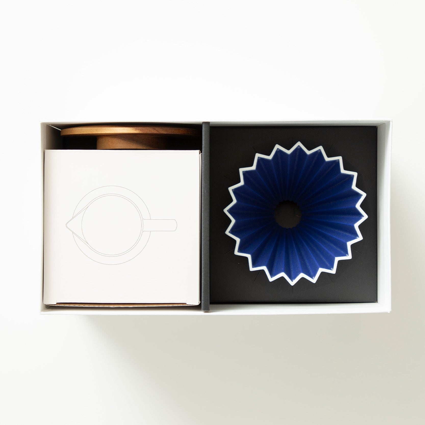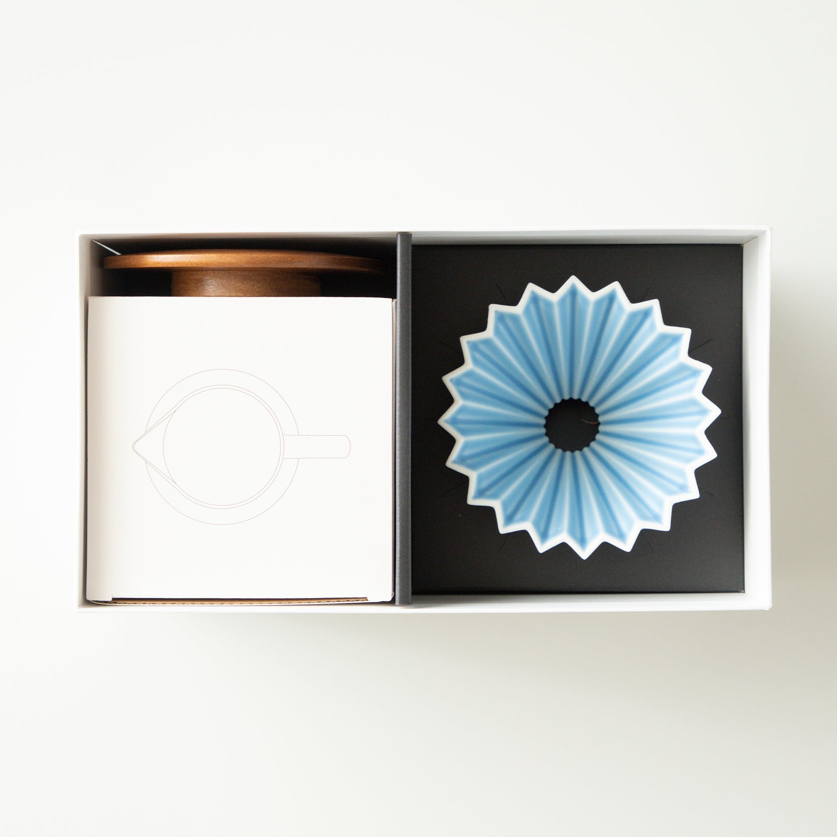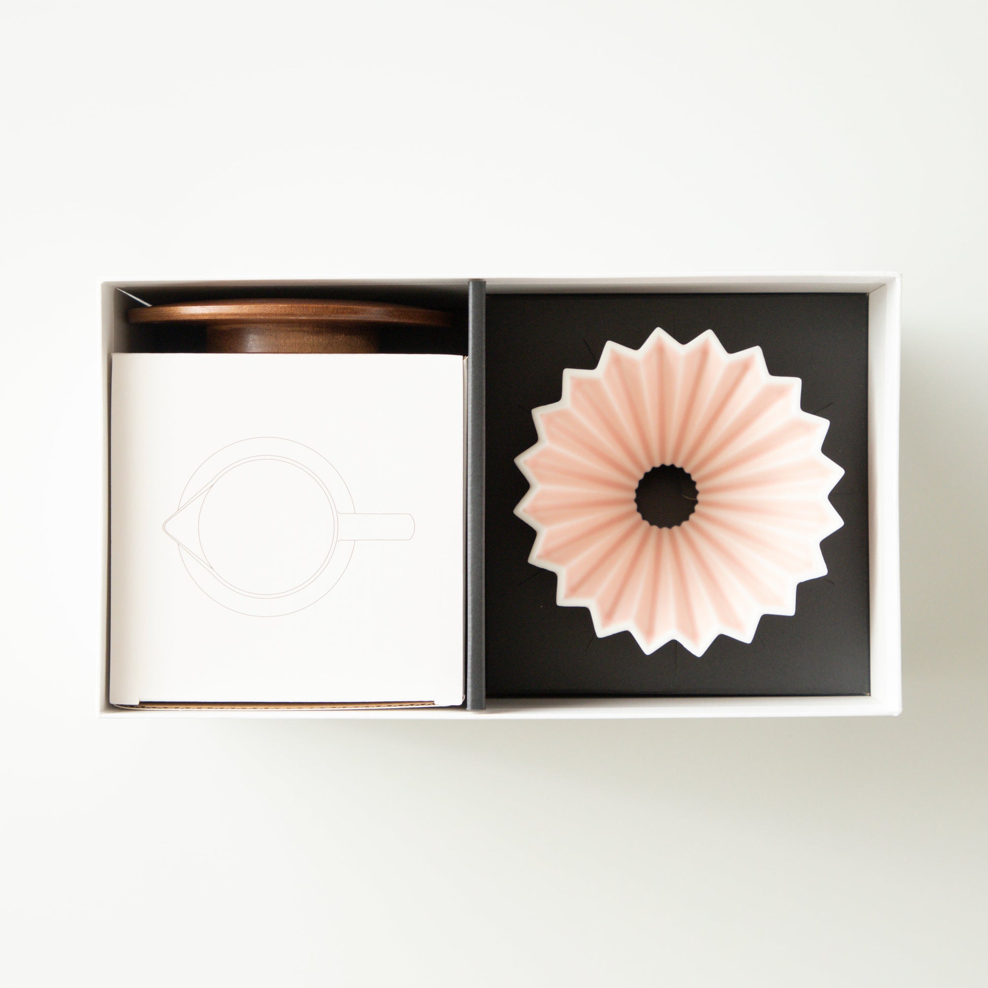 This is an original ORIGAMI Online Store gift box that includes the ORIGAMI Dripper S, aroma glass coffee server, holder, and paper filter.
