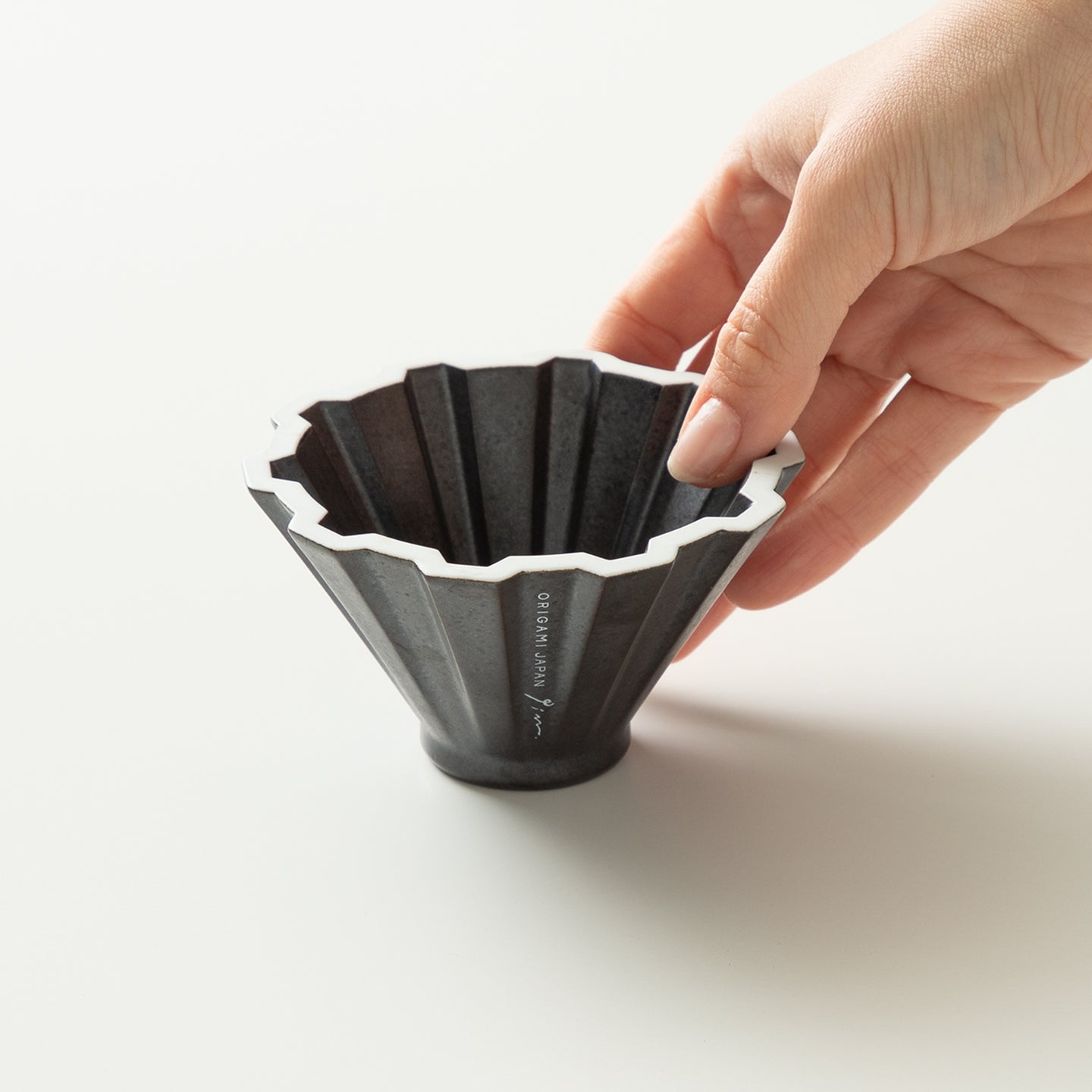 The dripper body features a thicker design than the previous ORIGAMI dripper. During the initial extraction phase, the water's impact on the dripper's temperature rise is gradual, preventing excessive energy transfer. In the latter extraction phase, the ceramic material and its thickness enhance heat retention, allowing the temperature to decrease slowly. Furthermore, the compact shape, with a height kept to 6cm, enables flexible control over the kettle spout height.