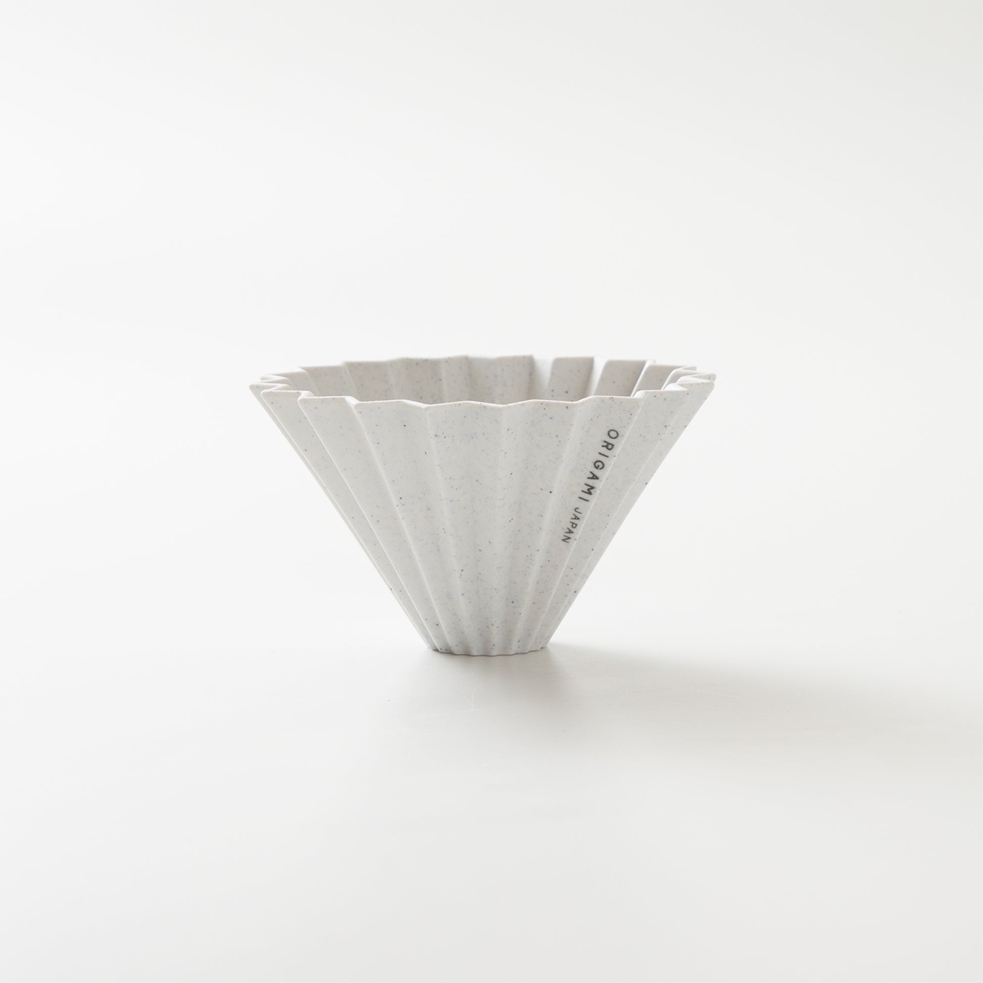 The 20 ribs (grooves) create a space between the dripper and the paper, allowing the hot water to escape smoothly and enabling a wide variety of brewing. The ORIGAMI Dripper's simple, lean product design has a “shimmering” appearance that can be felt because it is made from clay mixed with crushed recycled porcelain and fired.